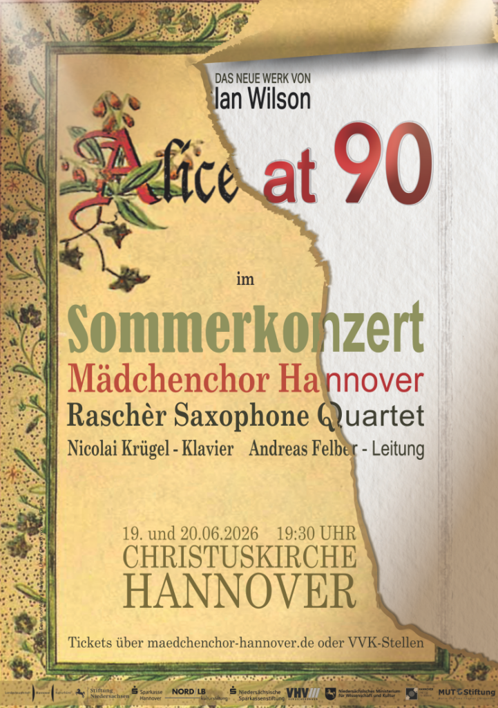 Mädchenchor Hannover Sommerkonzert mit Nicolai Krügel (Klavier). Gast: Raschèr Saxophonquartett. Mit 2. Aufführung der Auftragskomposition "Alice at 90" von Ian Wilson. (Weitere Informationen folgen)